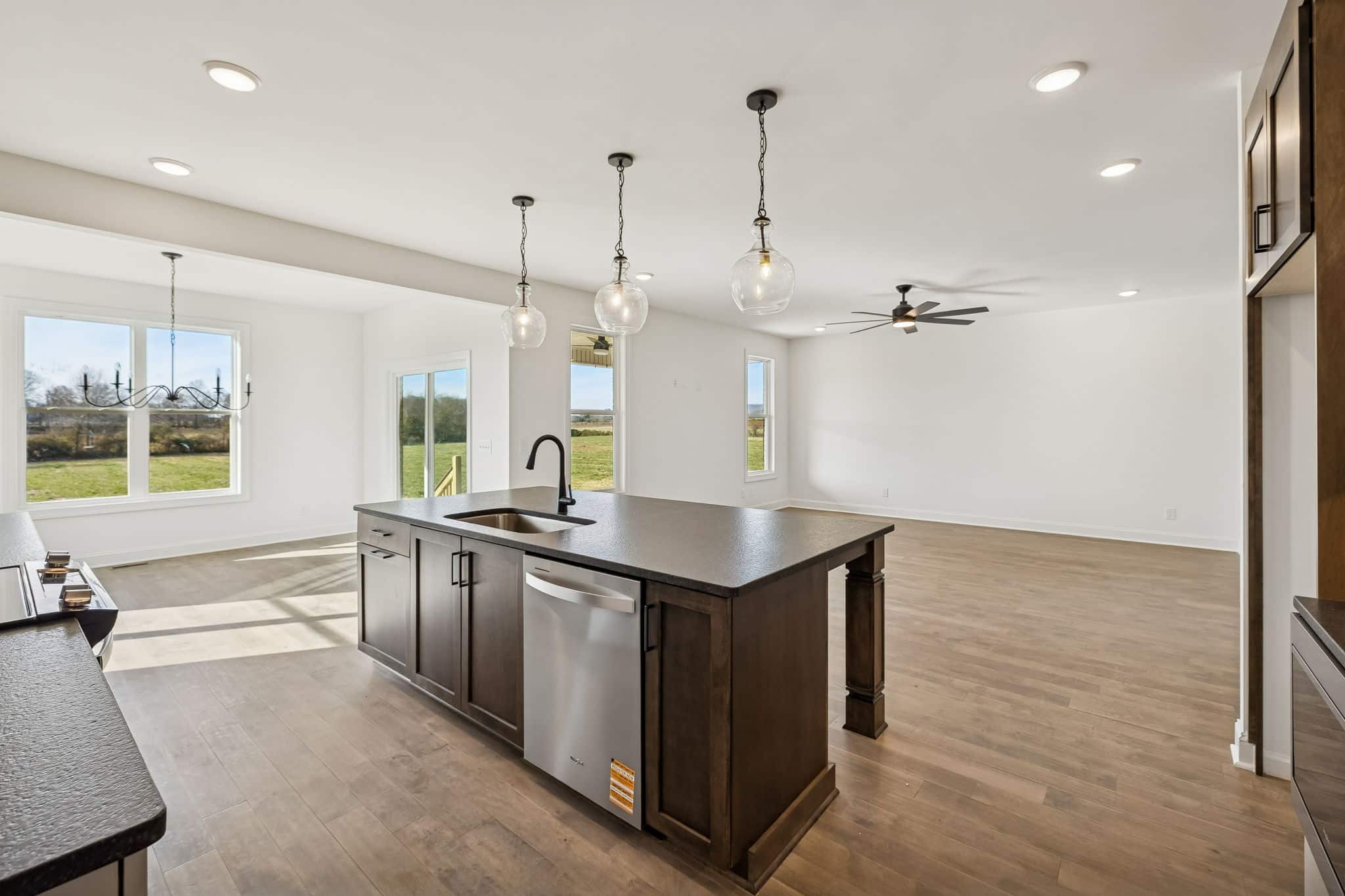 Modern open-concept kitchen with dark island, pendant lights, large windows, and hardwood floors.