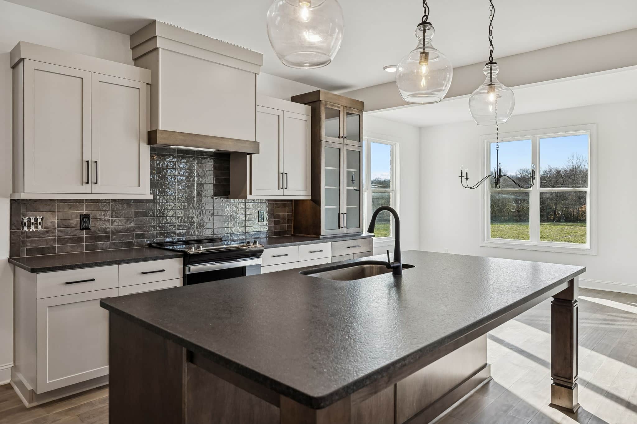 Modern kitchen with large central island, pendant lights, and white cabinetry.