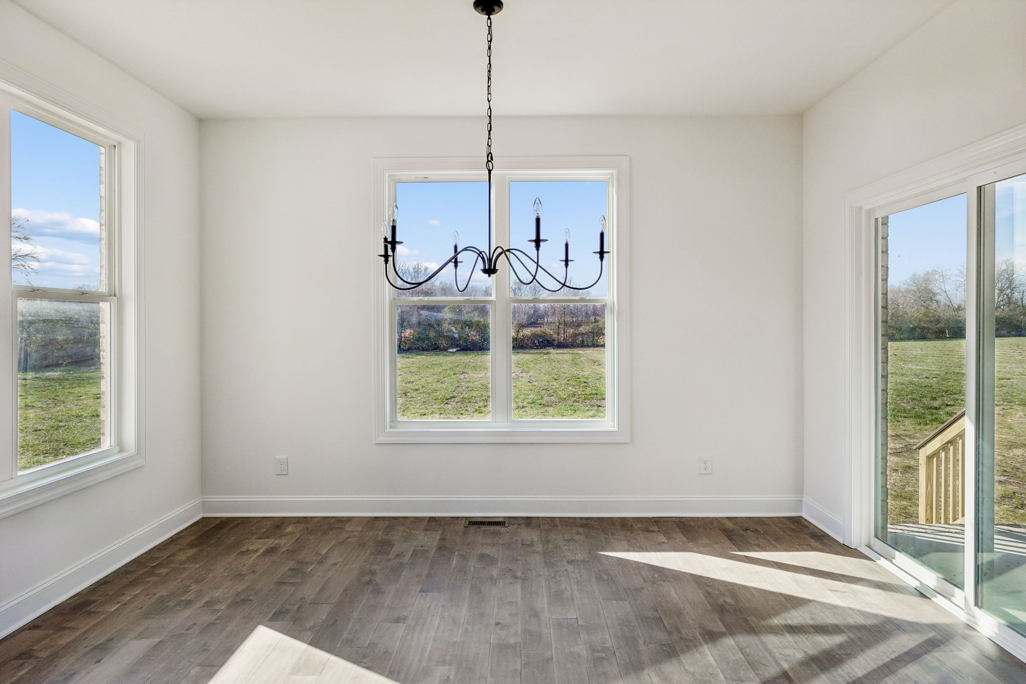 Bright dining room interior with chandelier and large windows overlooking green landscape.