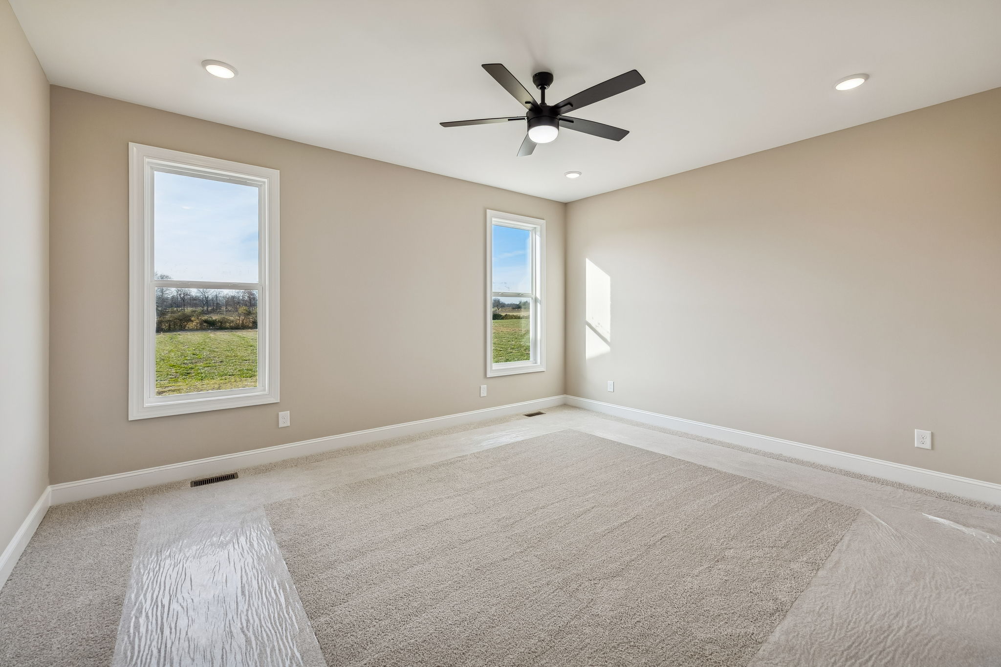 Spacious empty room with beige walls, carpet, two large windows, and a ceiling fan.