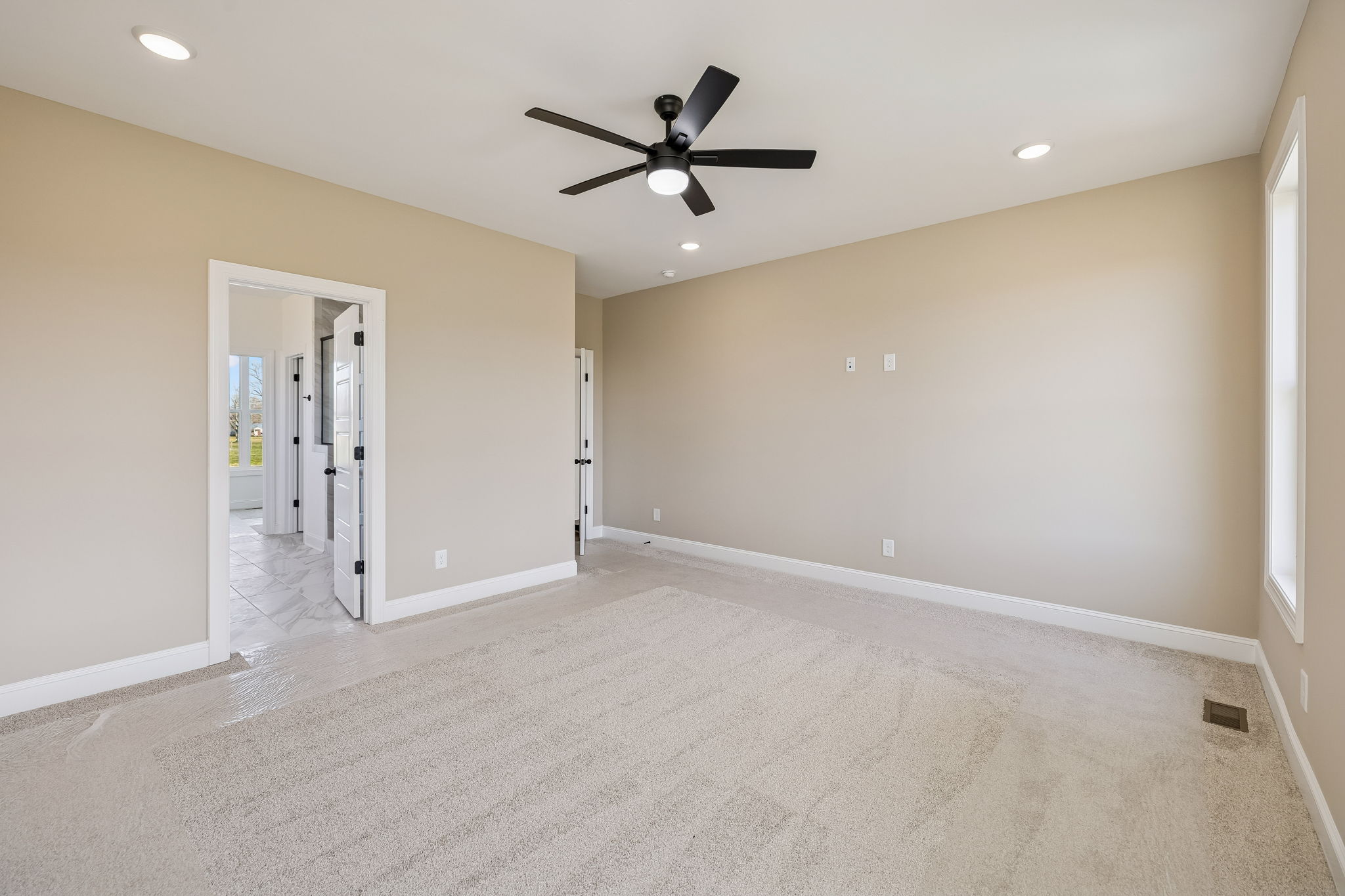 Empty room with beige walls, carpet, and ceiling fan, doorway to tiled area.