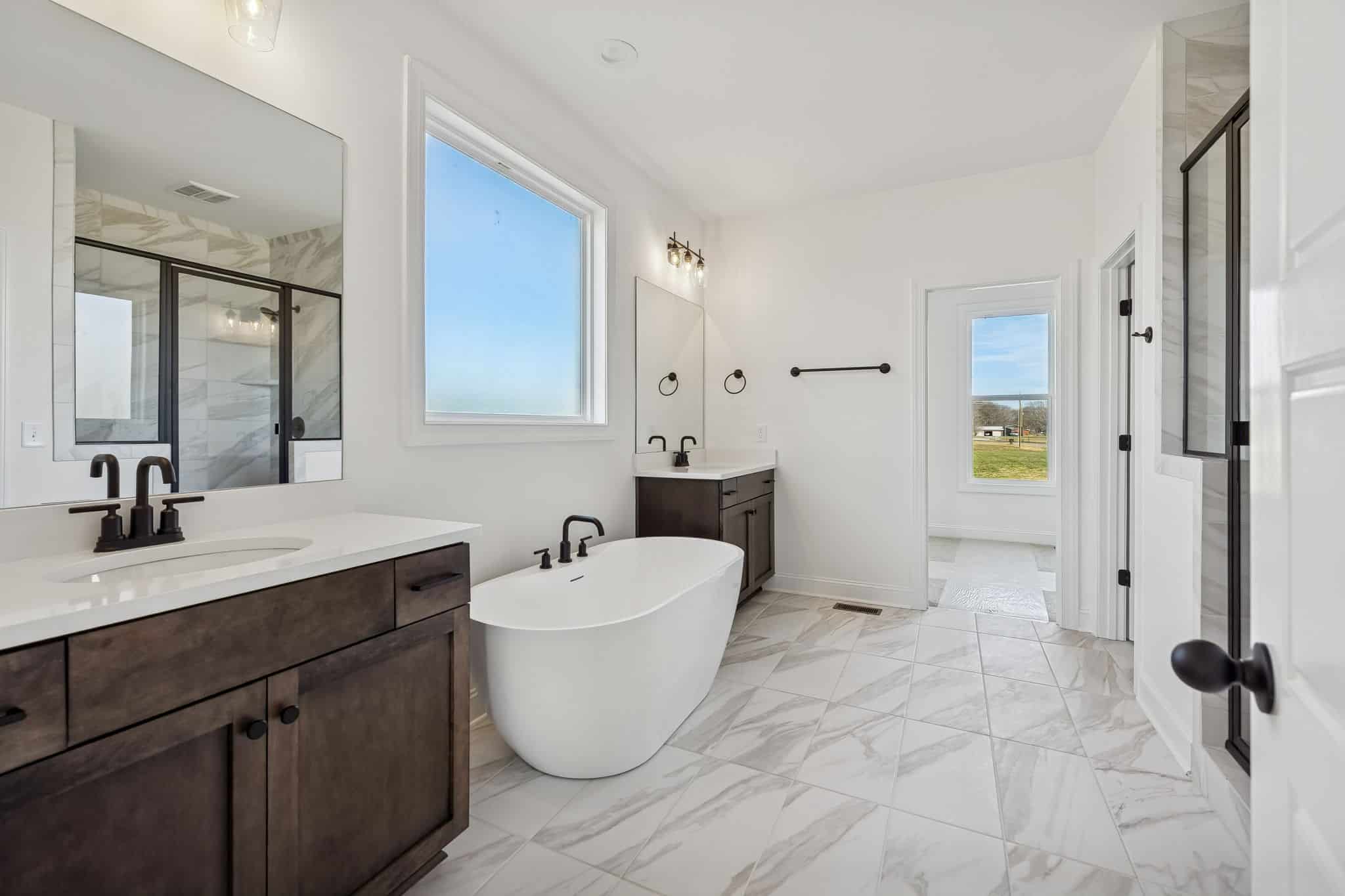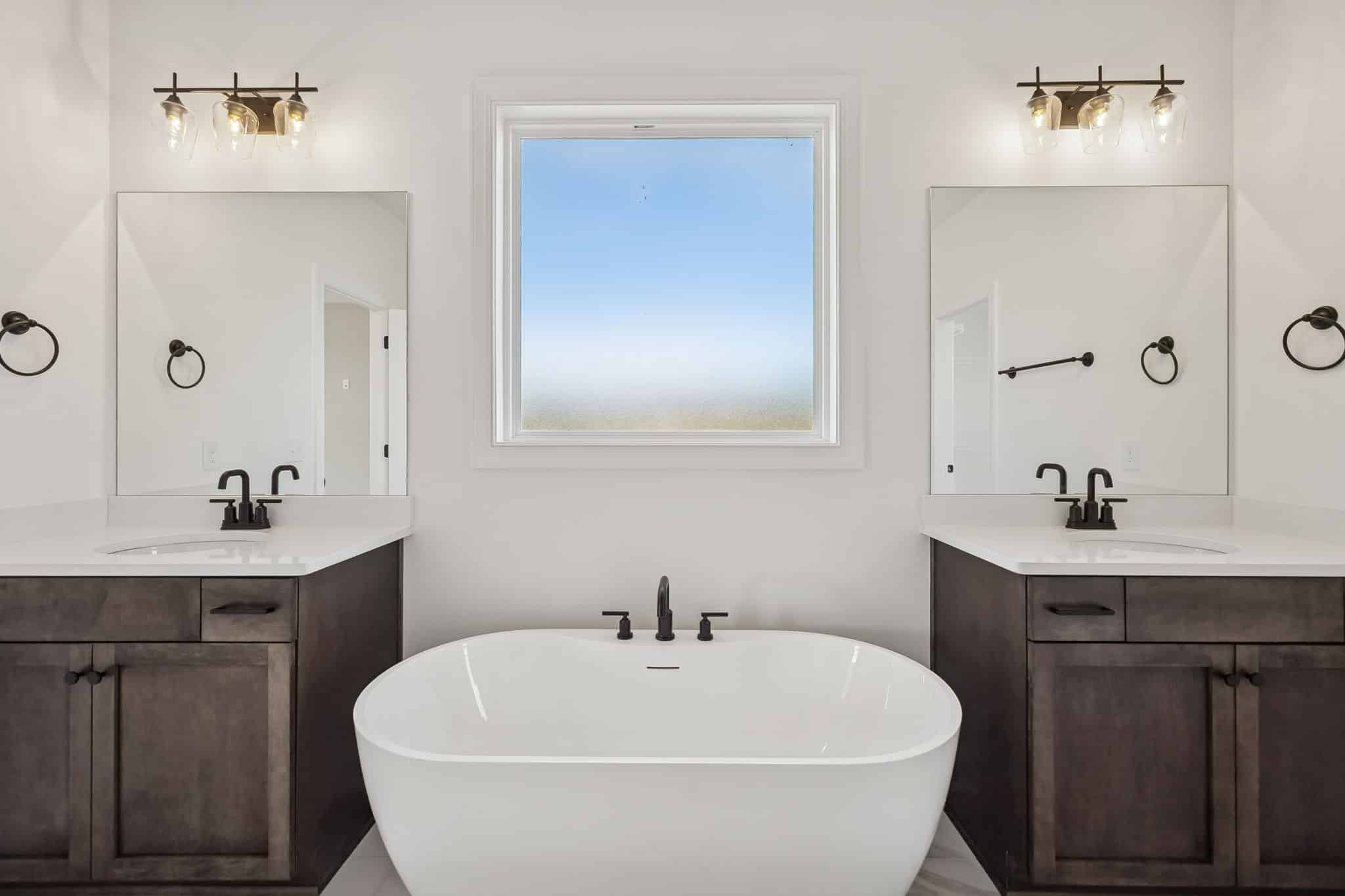 Modern bathroom with freestanding tub, dual sinks, large mirrors, and elegant lighting fixtures.