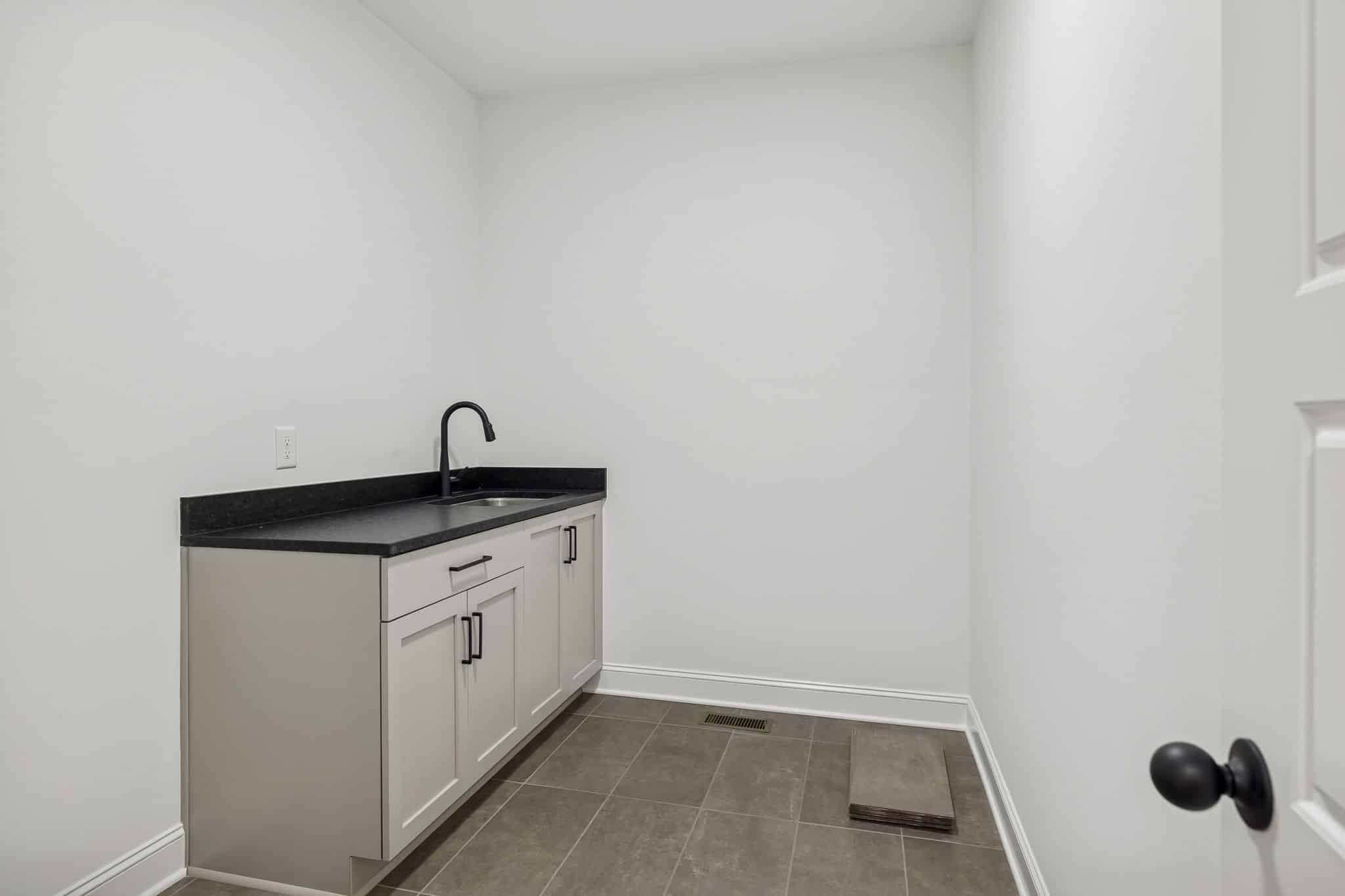 Modern laundry room with gray cabinets, black countertop, and sink faucet.