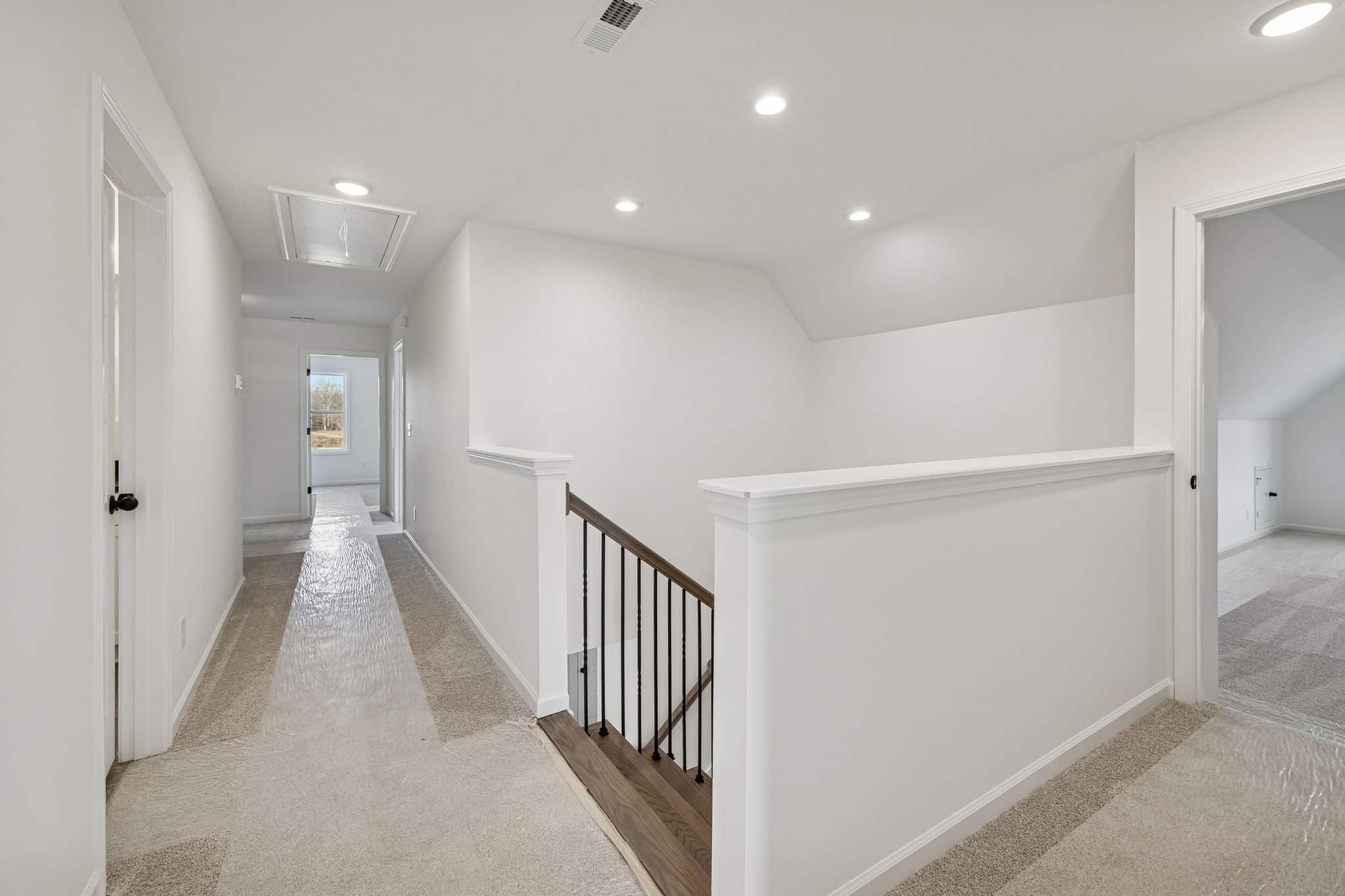 Bright hallway with beige carpet and recessed lighting, leading to a door with natural light.