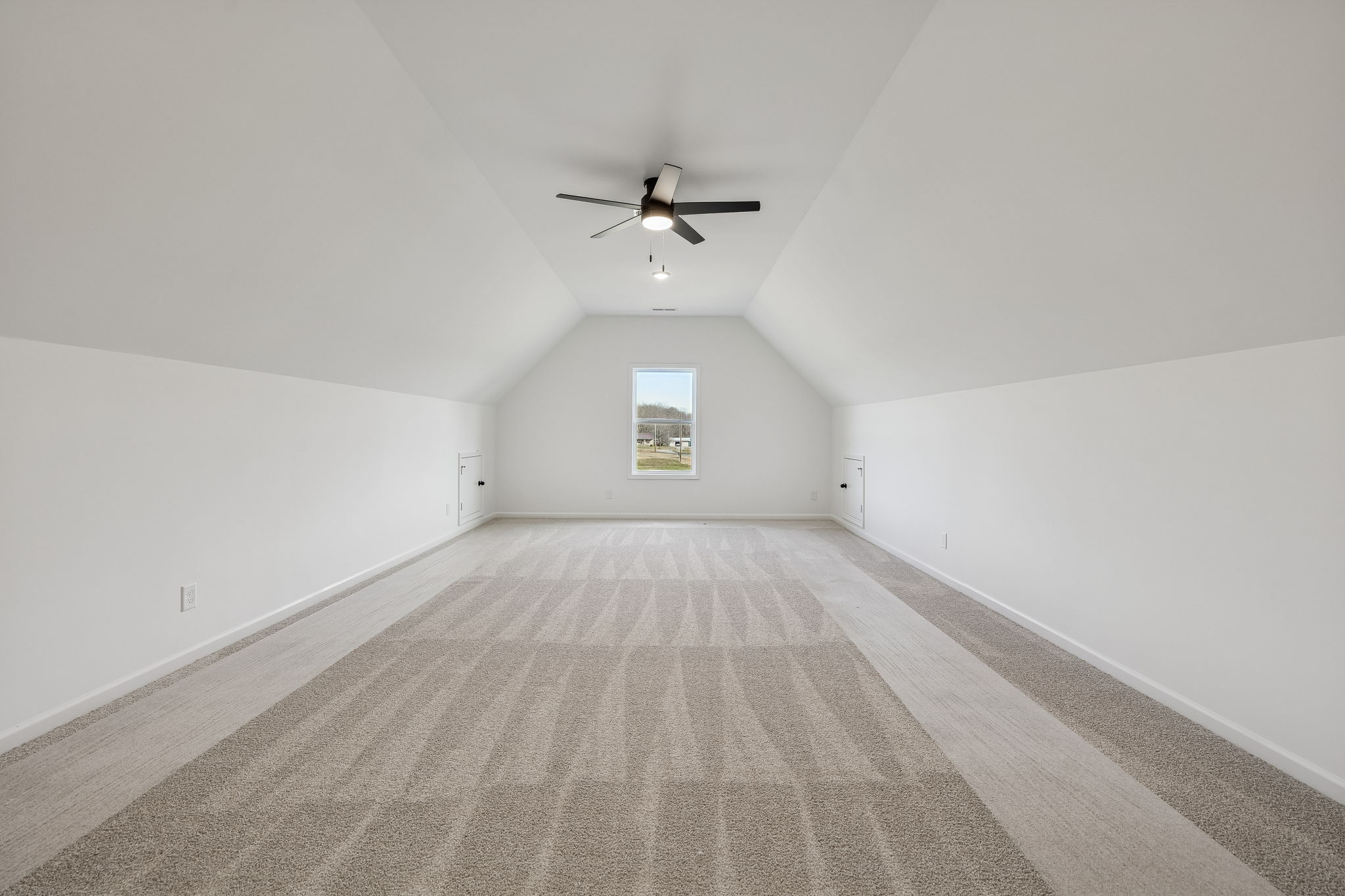 Spacious attic room with sloped ceiling, carpet flooring, ceiling fan, and small window for natural light.