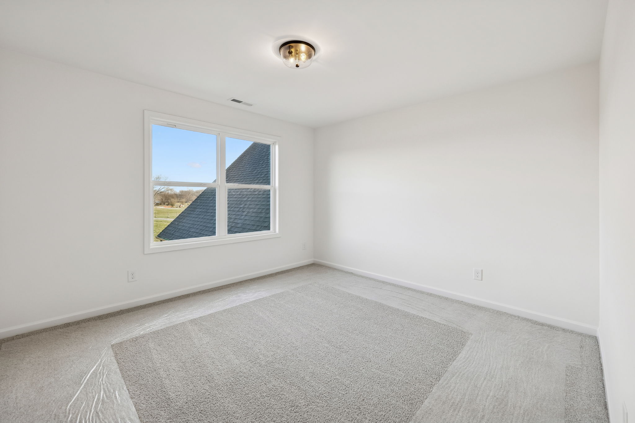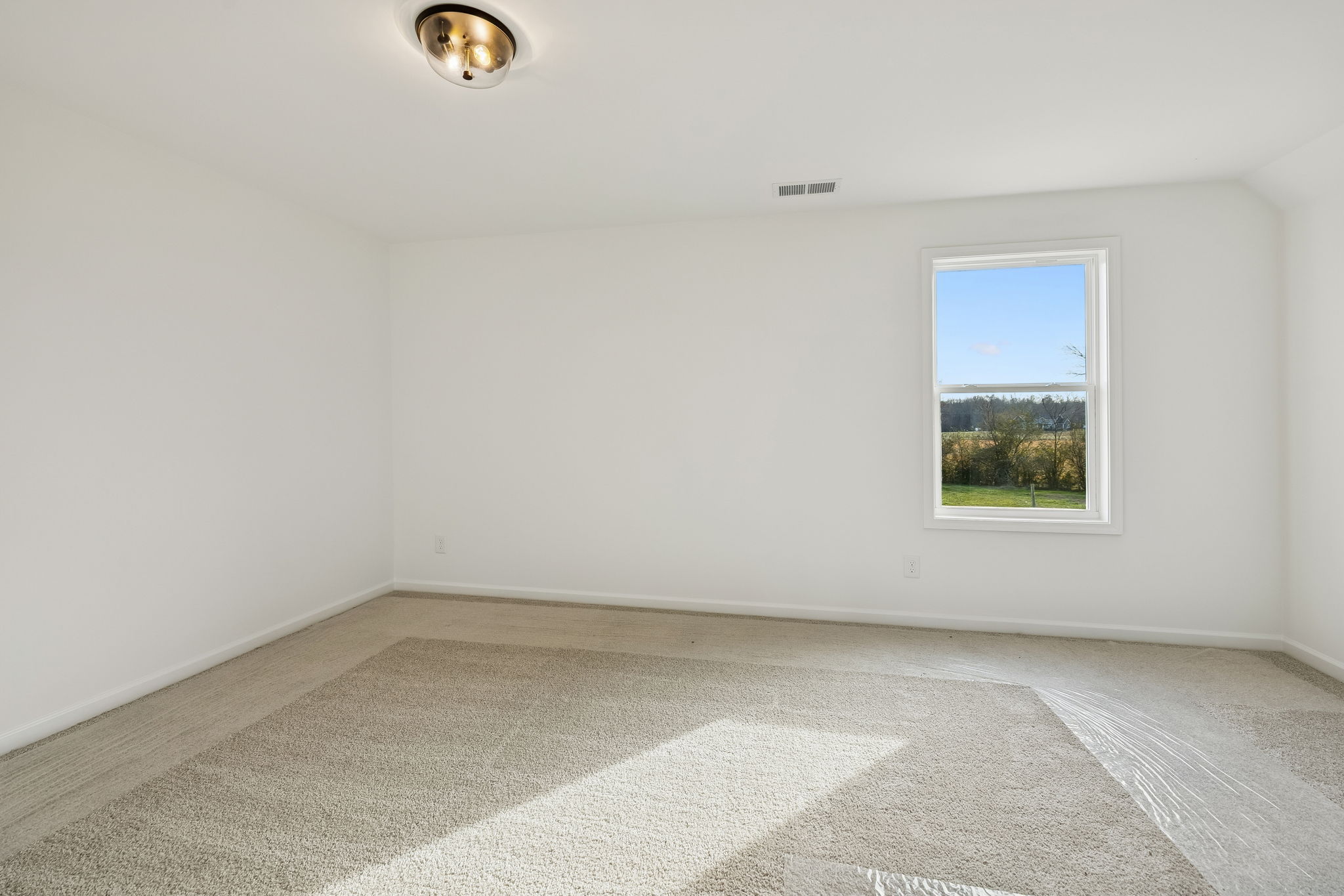 Empty carpeted room with a large window and ceiling light fixture. Room is well-lit with natural light.