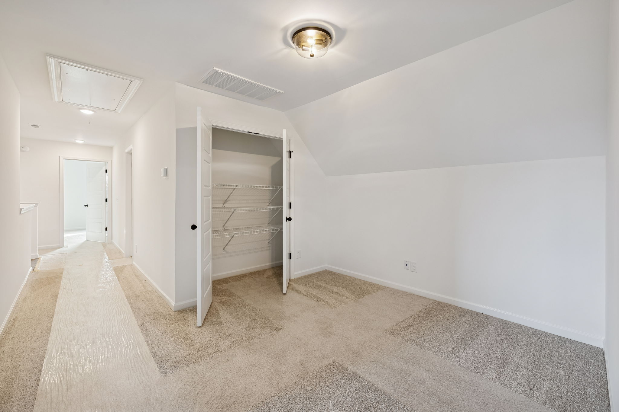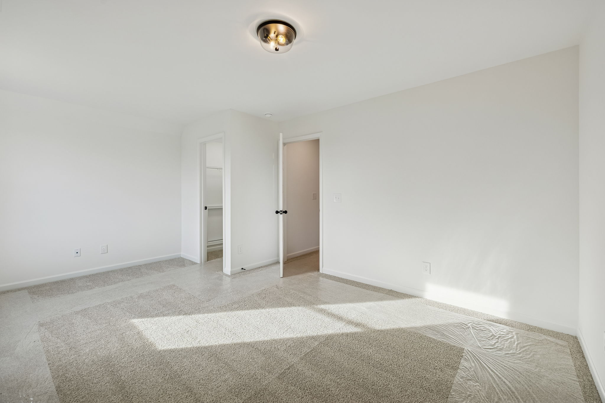 Empty room with beige carpet, white walls, and ceiling light. Door leads to closet.