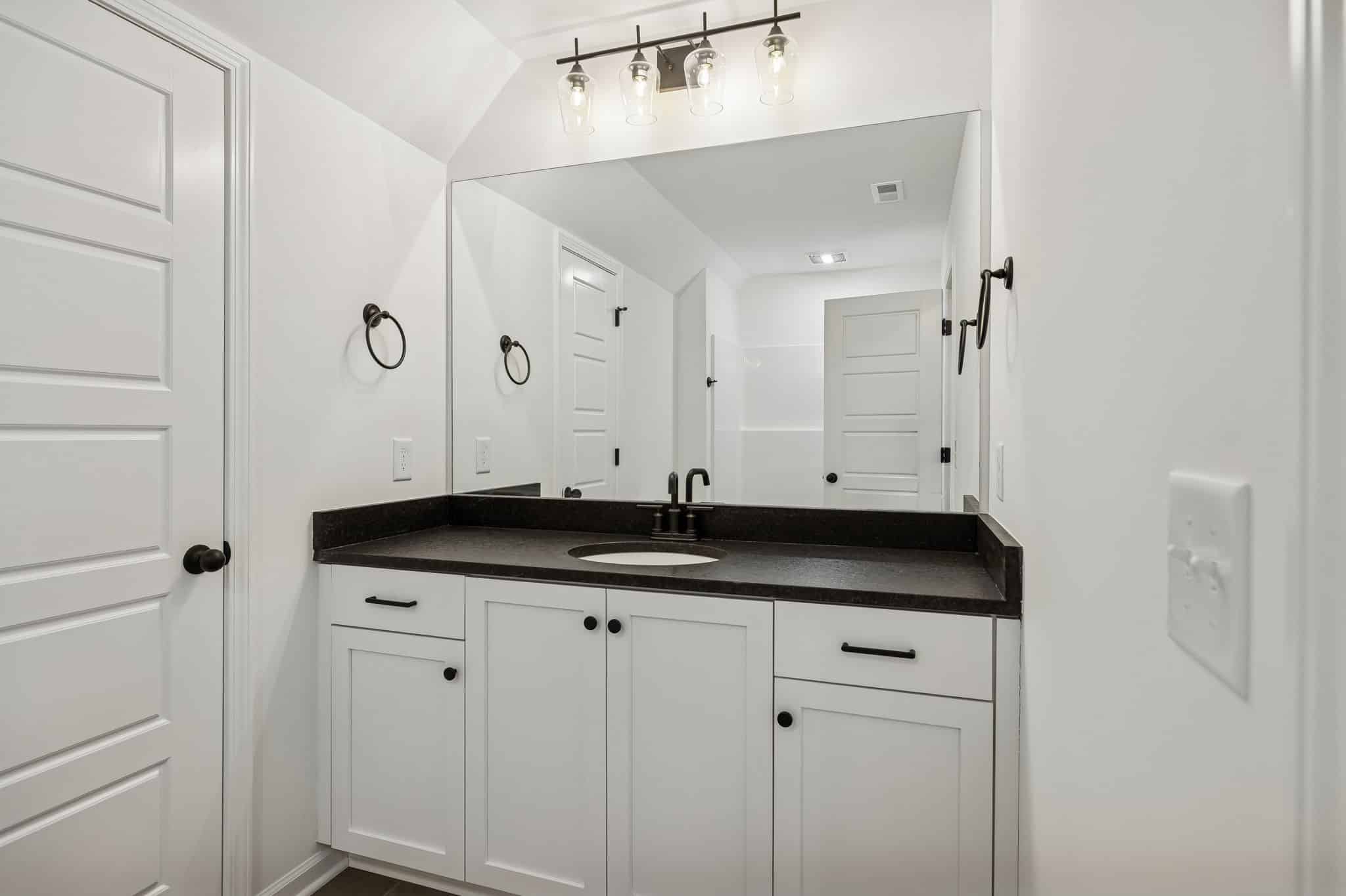 Modern white bathroom with black countertop, large mirror, and stylish lighting above vanity.