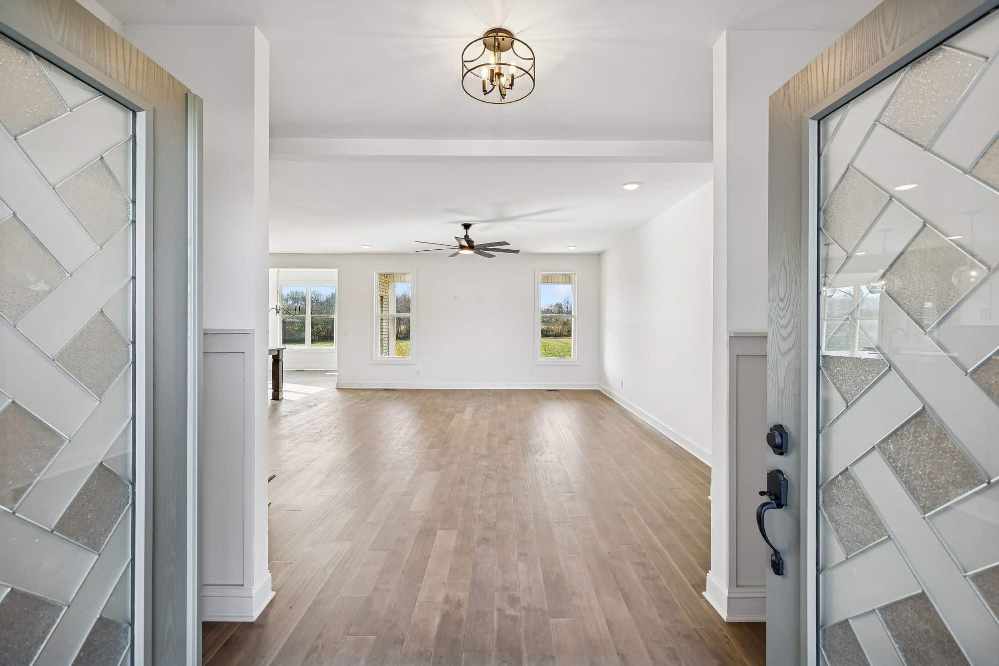 Open entryway leading to a spacious, empty living room with hardwood floors and ceiling fan.