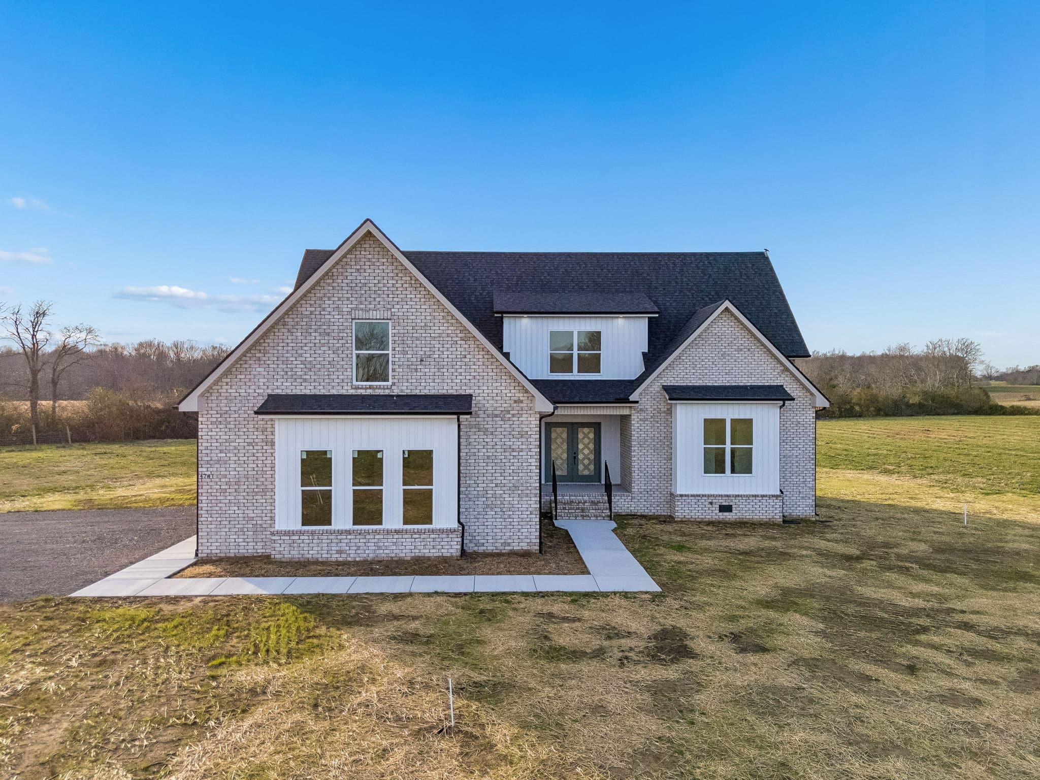 Brick house with large windows and double garage on a clear day in a rural setting.